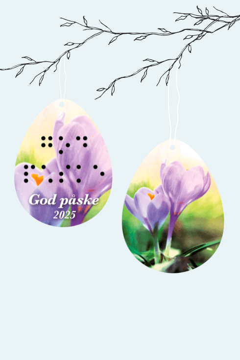 Ved at støtte Dansk Blindesamfund med et valgfrit beløb, hjælper du os med at gøre en forskel. Som tak sender vi dig 2 fine påskeophæng, så du kan pynte op til påske med mening og samtidig vise din støtte til Dansk Blindesamfund.