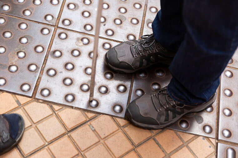 Illustration af en blind person, som stopper ved et opmærksomhedsfelt.